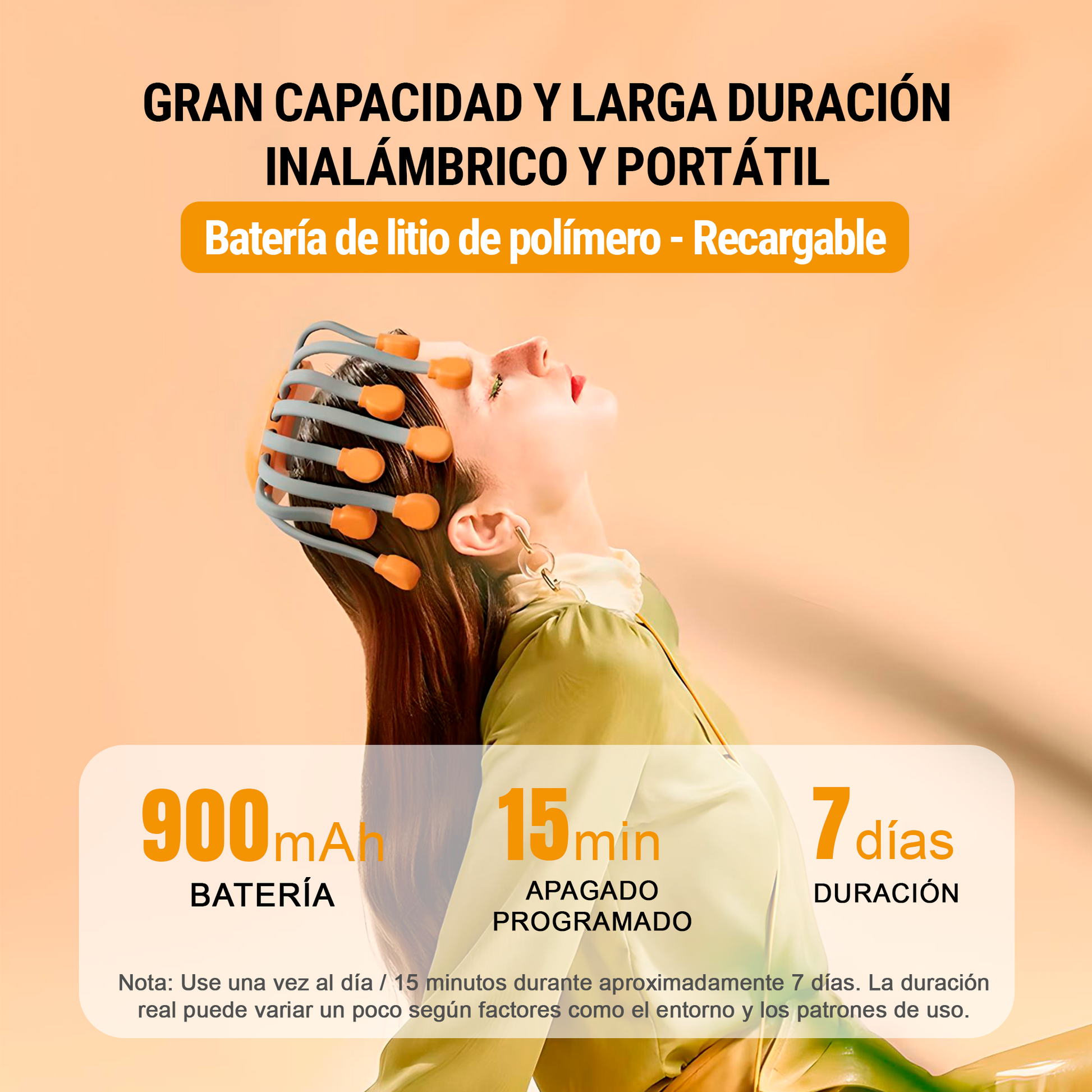 Su diseño de pulpo cubre todo el cuero cabelludo para un masaje envolvente de 360°, estimulando la circulación y ayudando a aliviar migrañas o tensión acumulada.